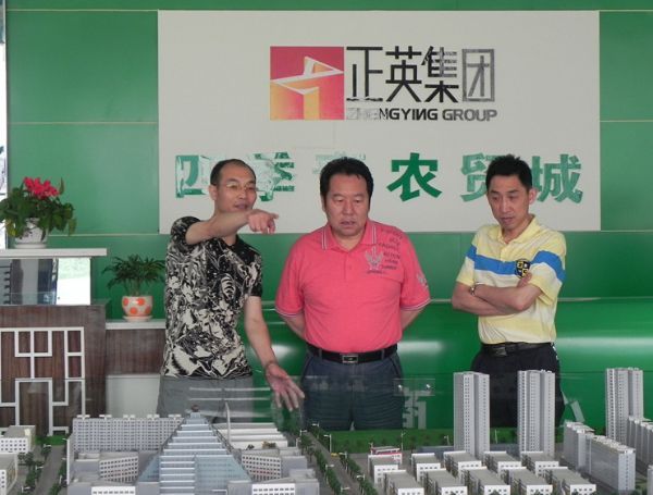 图1:市发改委副书记副主任钱克强(左二)正在听取正英集团董事长殷武伦(左一)介绍四季青农贸城项目的情况